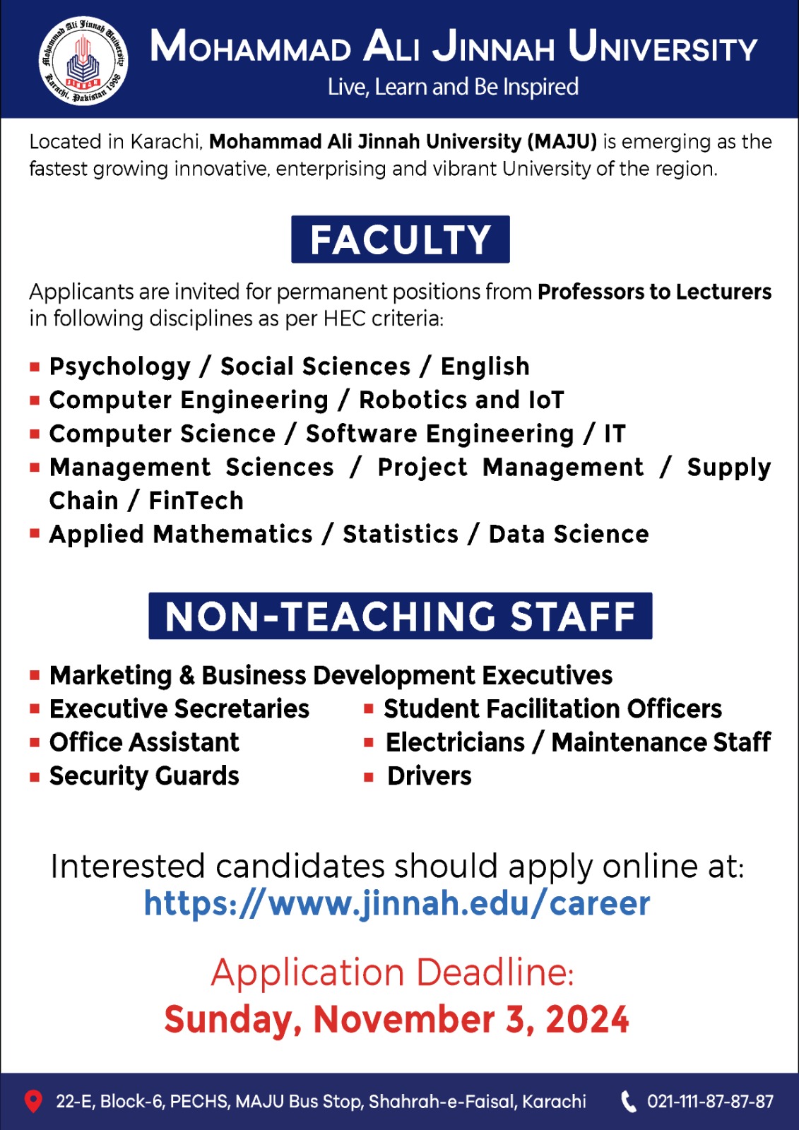 Applicants apply Online through MAJU Official Site https://www.jinnah.edu.